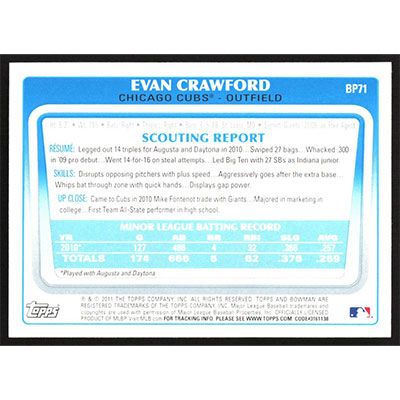 This is a 2011 Bowman Prospects Evan Crawford baseball card. The card is #BP71 and pictures show condition.
