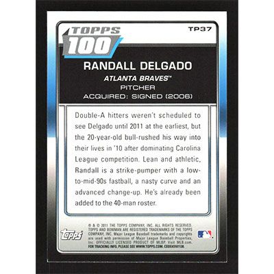 This is a 2011 Bowman Topps 100 Randall Delgado baseball card. The card is #TP37 and pictures show condition.