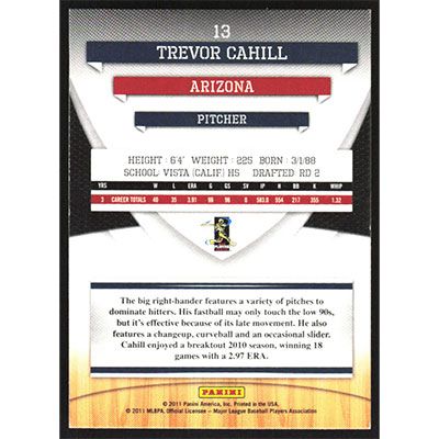This is a 2011 Donruss Elite Extra Edition Trevor Cahill baseball card. The card is #13 and pictures show condition.