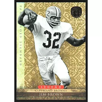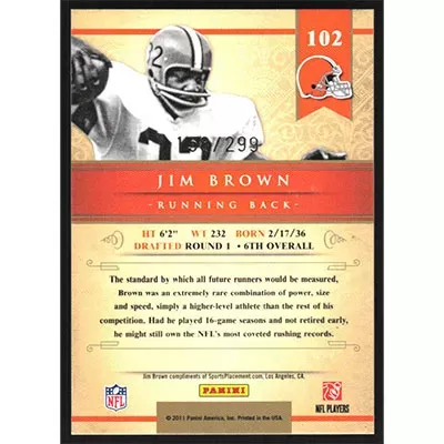 This is a 2011 Panini Gold Standard Jim Brown football card. The card is #102 and pictures show condition. This card is limited; #'d 158/299. Team(s): Cleveland Browns