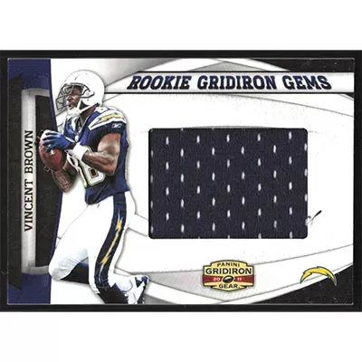 This is a 2011 Panini Gridiron Gear Rookie Gridiron Gems Jerseys Vincent Brown football card. The card is #2 and pictures show condition. This card is limited; #'d 15/25.