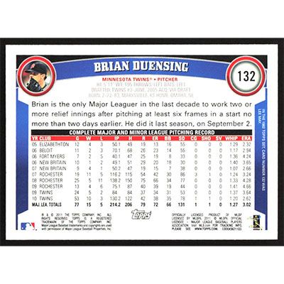 This is a 2011 Topps Brian Duensing baseball card. The card is #132 and pictures show condition.