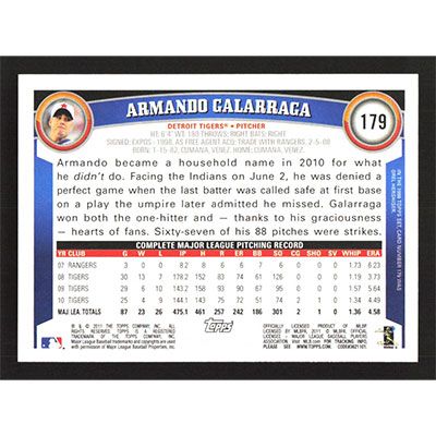 This is a 2011 Topps Armando Galarraga baseball card. The card is #179 and pictures show condition.