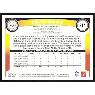 This is a 2011 Topps Curtis Brown football card. The card is #214 and pictures show condition.