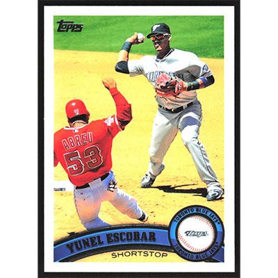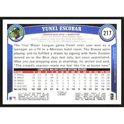 This is a 2011 Topps Yunel Escobar baseball card. The card is #217 and pictures show condition.