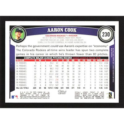 This is a 2011 Topps Aaron Cook baseball card. The card is #230 and pictures show condition.