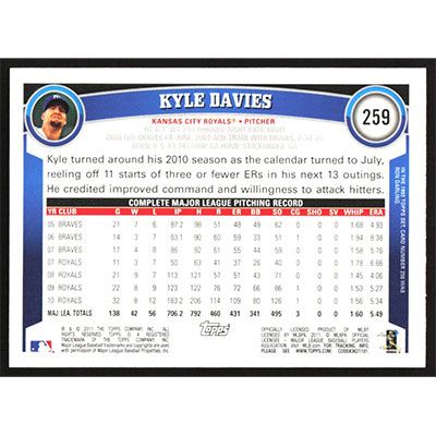 This is a 2011 Topps Kyle Davies baseball card. The card is #259 and pictures show condition.