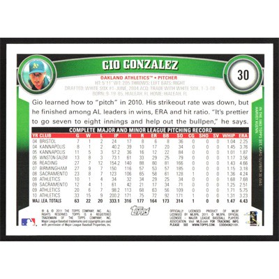 This is a 2011 Topps Gio Gonzalez baseball card. The card is #30 and pictures show condition.
