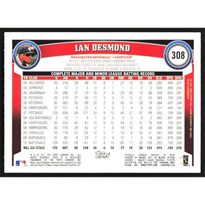 This is a 2011 Topps Ian Desmond baseball card. The card is #308 and pictures show condition.