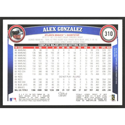 This is a 2011 Topps Alex Gonzalez baseball card. The card is #310 and pictures show condition.