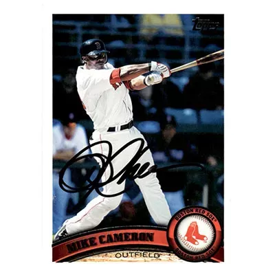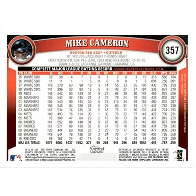 This is a 2011 Topps Mike Cameron autographed baseball card. This card has been signed, in black, by Mike Cameron, and is guaranteed authentic by Ballcardz.com. The card is #357 and is in NM-MT condition.