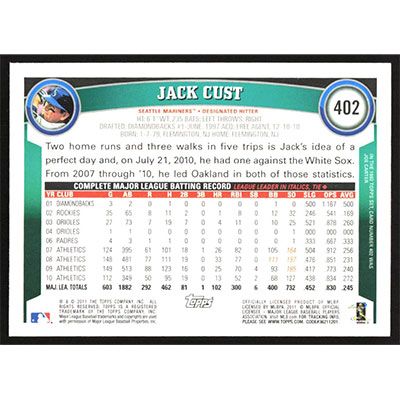 This is a 2011 Jack Cust baseball card. The card is #402 and pictures show condition.