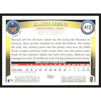 This is a 2011 Topps Samuel Deduno baseball card. The card is #412 and pictures show condition.