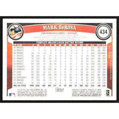 This is a 2011 Topps Mark DeRosa baseball card. The card is #434 and pictures show condition.