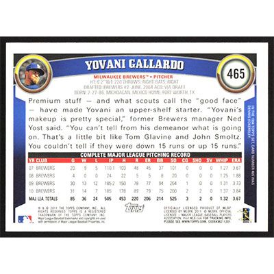 This is a 2011 Topps Yovani Gallardo baseball card. The card is #465 and pictures show condition.