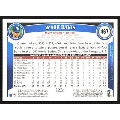 This is a 2011 Topps Wade Davis baseball card. The card is #467 and pictures show condition.