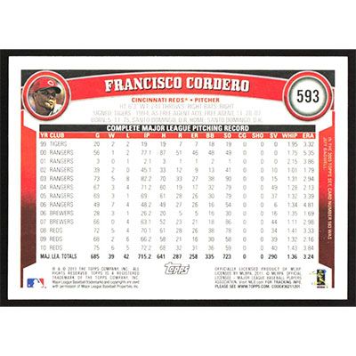 This is a 2011 Topps Francisco Cordero baseball card. The card is #593 and pictures show condition.