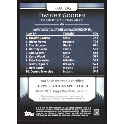 This is a 2011 Topps 60 Autographs Dwight Gooden autographed baseball card. This card has been signed, in blue, by Dwight Gooden, and is certified authentic by Topps. The card is #T60A-DG and pictures show condition.