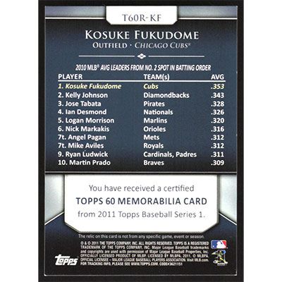 This is a 2011 Topps 60 Relics Kosuke Fukudome Jersey w/ Pinstripe baseball card. The card is #T60R-KF and pictures show condition.