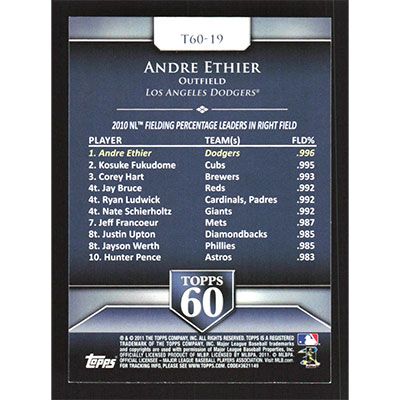 This is a 2011 Topps 60 Andre Ethier baseball card. The card is #T60-19 and pictures show condition.