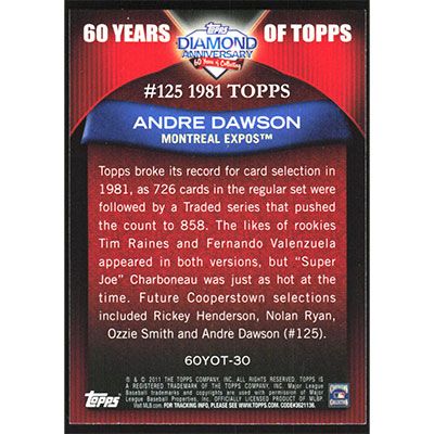 This is a 2011 Topps 60 Years of Topps Andre Dawson baseball card. The card is #60YOT-30 and pictures show condition.