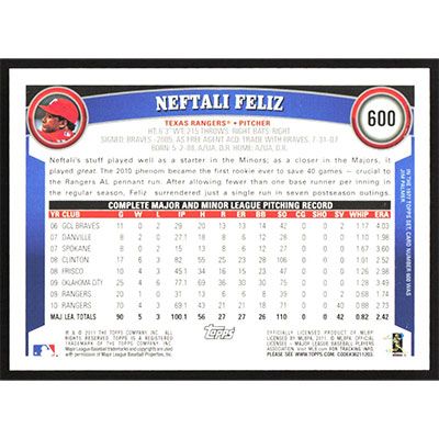 This is a 2011 Topps Neftali Feliz baseball card. The card is #600 and pictures show condition.