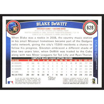 This is a 2011 Topps Blake DeWitt baseball card. The card is #628 and pictures show condition.