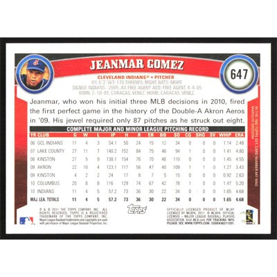 This is a 2011 Topps Jeanmar Gomez baseball card. The card is #647 and pictures show condition.