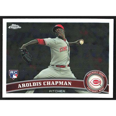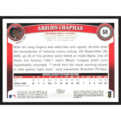 This is a 2011 Topps Chrome Aroldis Chapman baseball card. The card is #68 and pictures show condition.