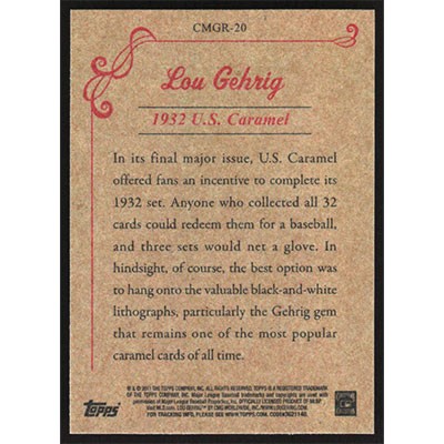 This is a 2011 Topps CMG Reprints Lou Gehrig 1933 U.S. Caramel baseball card. The card is #CMGR-20 and pictures show condition. Team(s): New York Yankees