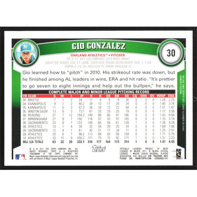 This is a 2011 Topps Cognac Diamond Anniversary Gio Gonzalez baseball card. The card is #30 and pictures show condition.