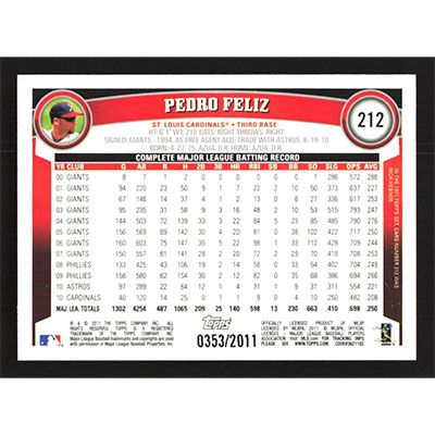 This is a 2011 Topps Gold Pedro Feliz baseball card. The card is #212 and pictures show condition. This card is limited; #'d 0353/2011. Team(s): St. Louis Cardinals