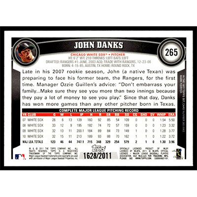 This is a 2011 Topps Gold John Danks baseball card. The card is #265 and pictures show condition. This card is limited; #'d 1628/2011. Team(s): Chicago White Sox