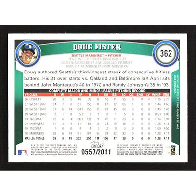 This is a 2011 Topps Gold Doug Fister baseball card. The card is #362 and pictures show condition. This card is limited; #'d 0557/2011. Team(s): Seattle Mariners