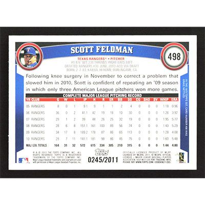 This is a 2011 Topps Gold Scott Feldman baseball card. The card is #498 and pictures show condition. This card is limited; #'d 0245/2011. Team(s): Texas Rangers