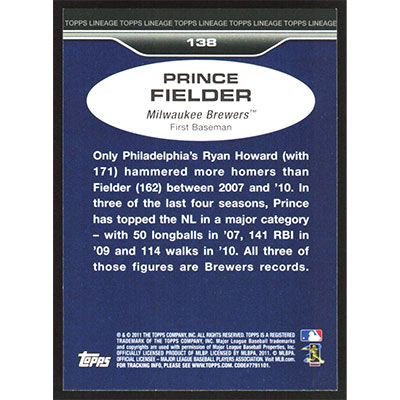 This is a 2011 Topps Lineage Prince Fielder baseball card. The card is #138 and pictures show condition.