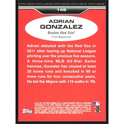 This is a 2011 Topps Lineage Adrian Gonzalez baseball card. The card is #145 and pictures show condition.