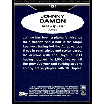 This is a 2011 Topps Lineage Johnny Damon baseball card. The card is #151 and pictures show condition.