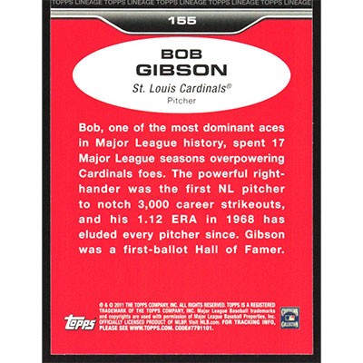 This is a 2011 Topps Lineage Bob Gibson baseball card. The card is #155 and pictures show condition.