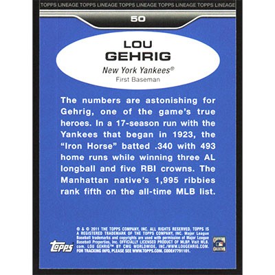 This is a 2011 Topps Lineage Lou Gehrig baseball card. The card is #50 and pictures show condition.