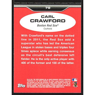 This is a 2011 Topps Lineage Carl Crawford baseball card. The card is #79 and pictures show condition.