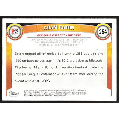 This is a 2011 Topps Pro Debut Adam Eaton autographed baseball card. This card has been signed, in blue, by Adam Eaton, and is guaranteed authentic by Ballcardz.com. The card is #254 and pictures show condition.