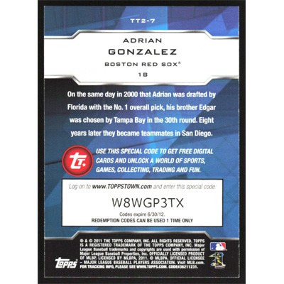 This is a 2011 Topps Topps Town Series 2 Adrian Gonzalez baseball card. The card is #TT2-7 and pictures show condition.