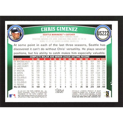This is a 2011 Topps Update Diamond Anniversary Chris Gimenez baseball card. The card is #US222 and pictures show condition.