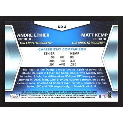 This is a 2011 Topps Update Diamond Duos Andre Ethier and Matt Kemp baseball card. The card is #DD-2 and pictures show condition. Team(s): Los Angeles Dodgers