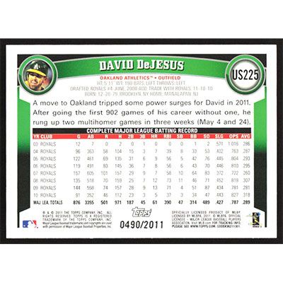 This is a 2011 Topps Update Gold David DeJesus baseball card. The card is #US225 and pictures show condition. This card is limited; #'d 0490/2011. Team(s): Oakland Athletics