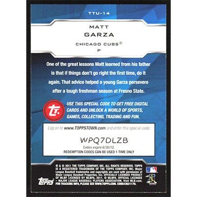 This is a 2011 Topps Update Topps Town Matt Garza baseball card. The card is #TTU-14 and pictures show condition.