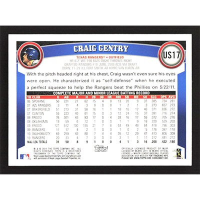 This is a 2011 Topps Update Craig Gentry baseball card. The card is #US17 and pictures show condition.