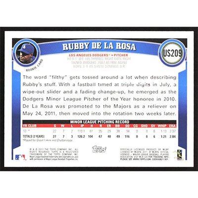 This is a 2011 Topps Update Rubby De La Rosa baseball card. The card is #US209 and pictures show condition. Team(s): Los Angeles Angels Rookie Card (RC)