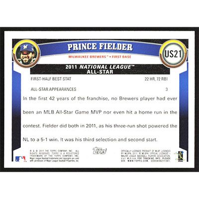 This is a 2011 Topps Update Prince Fielder All-Star baseball card. The card is #US21A and pictures show condition.